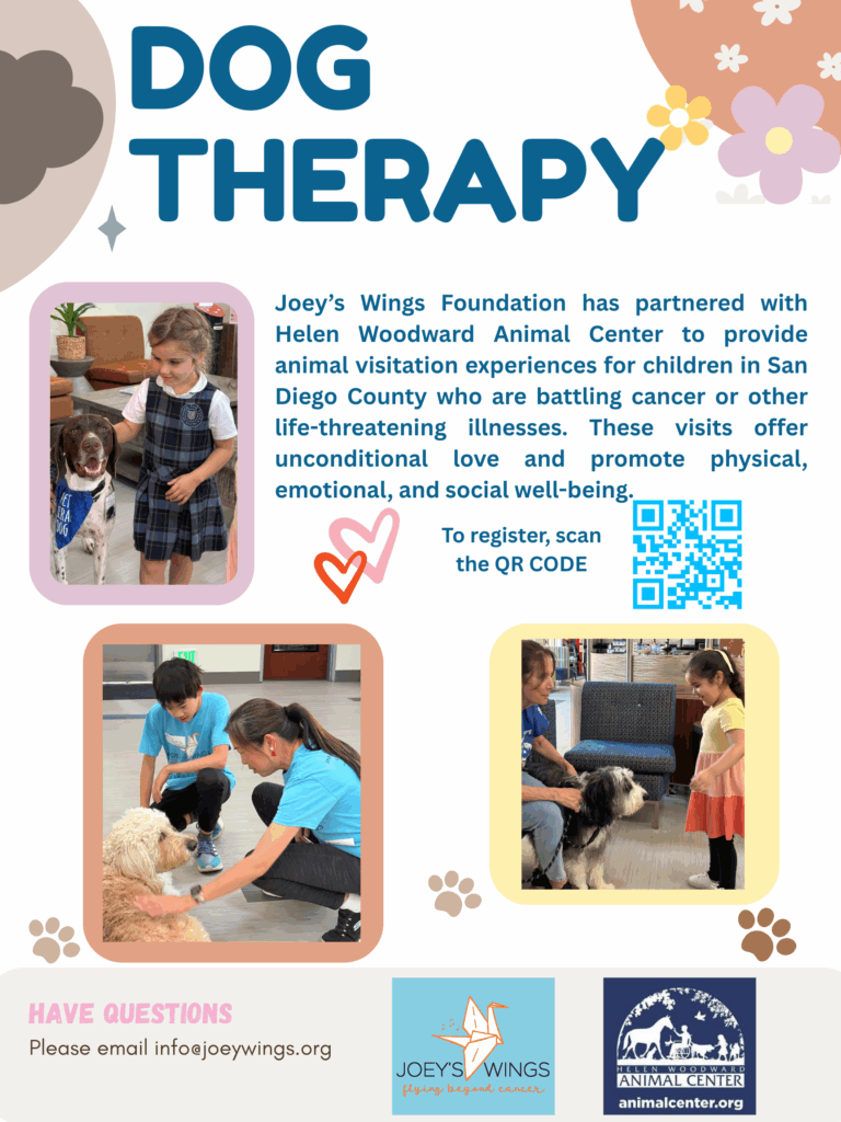 Joey’s Wings Foundation has partnered with Helen Woodward Animal Center to offer home visit with therapy dog for children with cancer in the San Diego County. Whether the child is in active or post treatment, we provide our warriors with unconditional love and a range of physical, emotional, and social benefits.